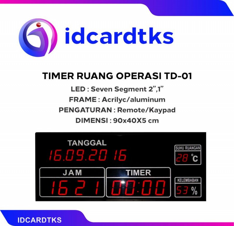 Timer Ruang OPerasi adalah alat yang digunakan untuk mengatur waktu dan menampilkan berbagai informasi seperti Jam, Tanggal, Temperatur dan kelembapan pada ruang operasi. Pengoperasian menggunakan remote. Spesikasi - Led Seven Segment - frame Aluminium / Acrilyc - Pengaturan dengan remote atau software - Ukuran : 90 cm x 40 cm Dapat di pesan sesuai ukuran dan model yang diinginkan Catatan : * Kami adalah produsen langsung dari produk diatas Sebelum pesan mohon WA / chat admin : +62 899-8927-322